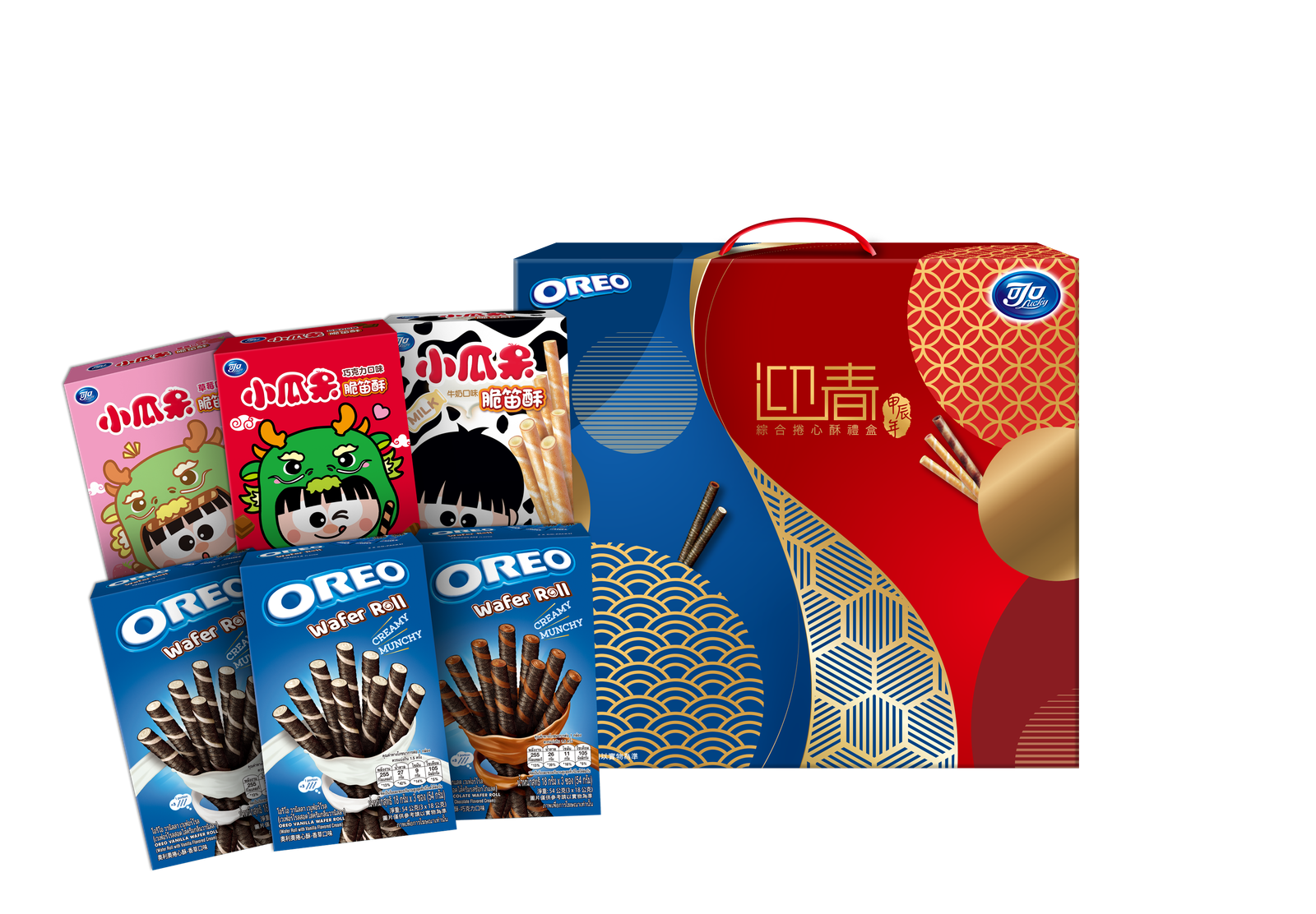 【內容物】Oreo 捲心酥-香草 54g*2 、Oreo 捲心酥-巧克力 54g、 脆笛酥-巧克力口味 65g、 脆笛酥-草莓口味 65g 、脆笛酥-牛奶口味 65g