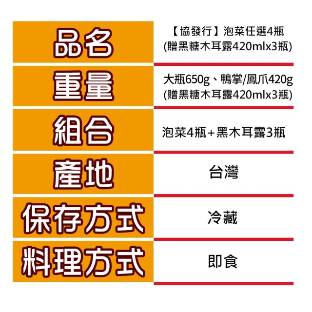 協發行泡菜 8種口味任選4瓶 – 650g/420g/瓶(送黑糖木耳露430ml x3瓶)